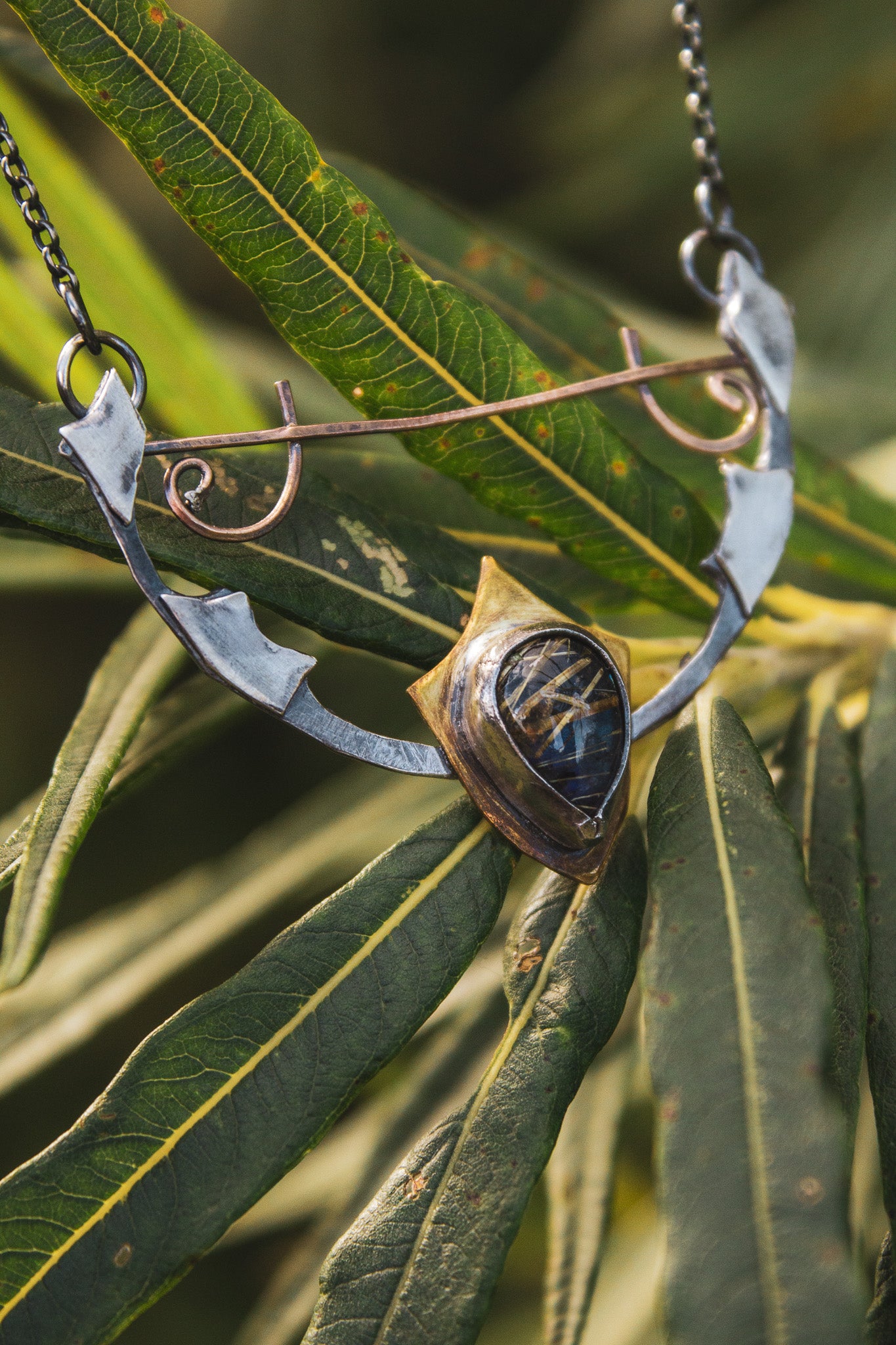 This piece is inspired by the Obsidian Veil oracle deck by Vixen of Erethereal (all rights reserved to Erethereal). It has been handcrafted in sterling silver with accents of brass and 14K gold-filled, featuring a stunning labradorite with golden rutile overlay. This doublet stone captures the shifting light, featuring the stunning blue labradorite and the golden threads of rutile quartz.