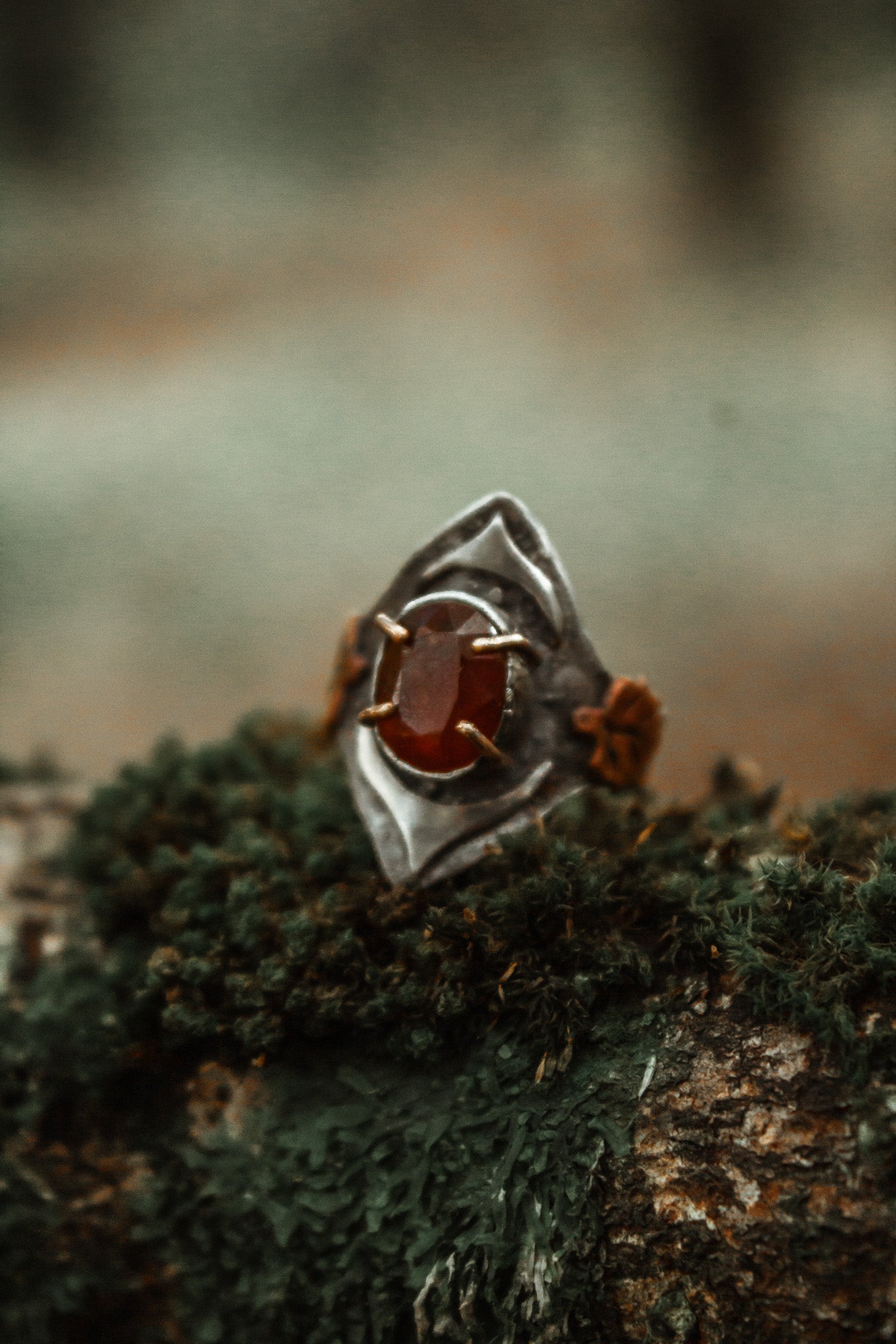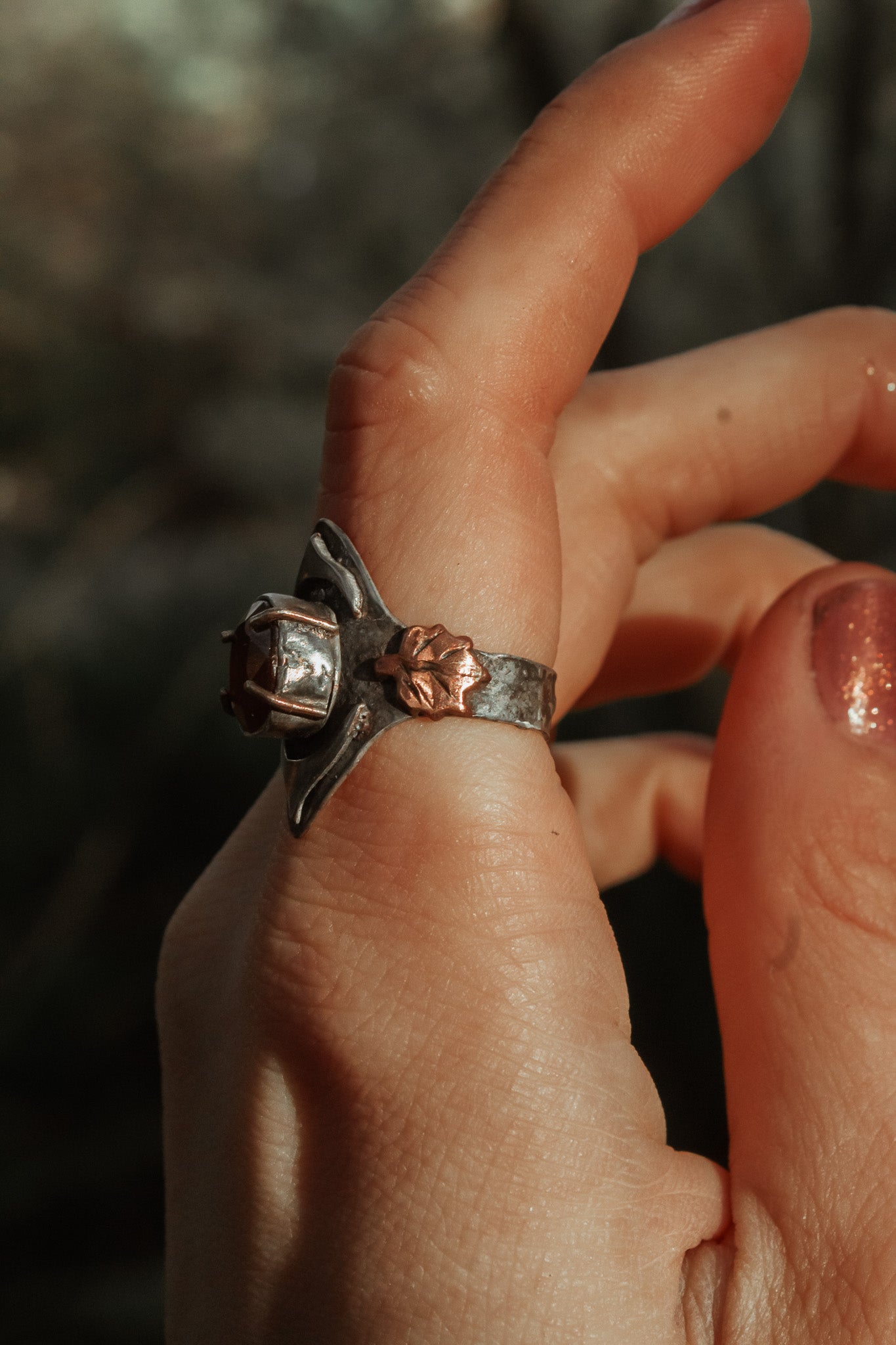 Made from sterling silver and holds a deep red Garnet in a 14k gold-filled prong setting. Small copper maple leaves rest on each side of the band, adding a quiet touch of warmth and nature. The Garnet is known as a stone of strength and passion, said to bring courage and energy to the wearer.