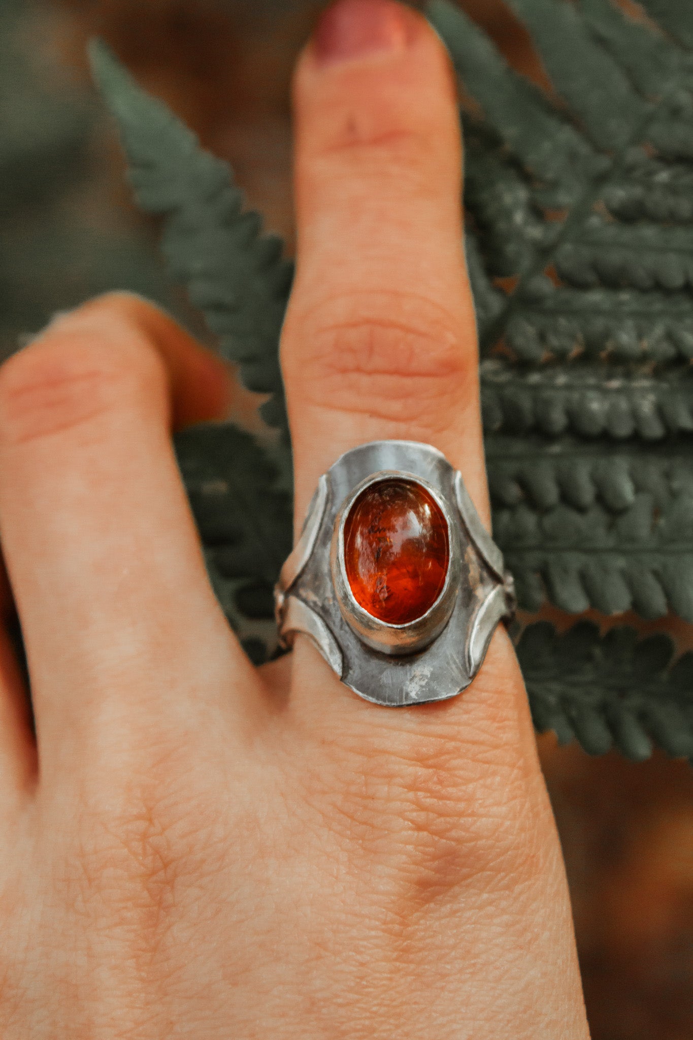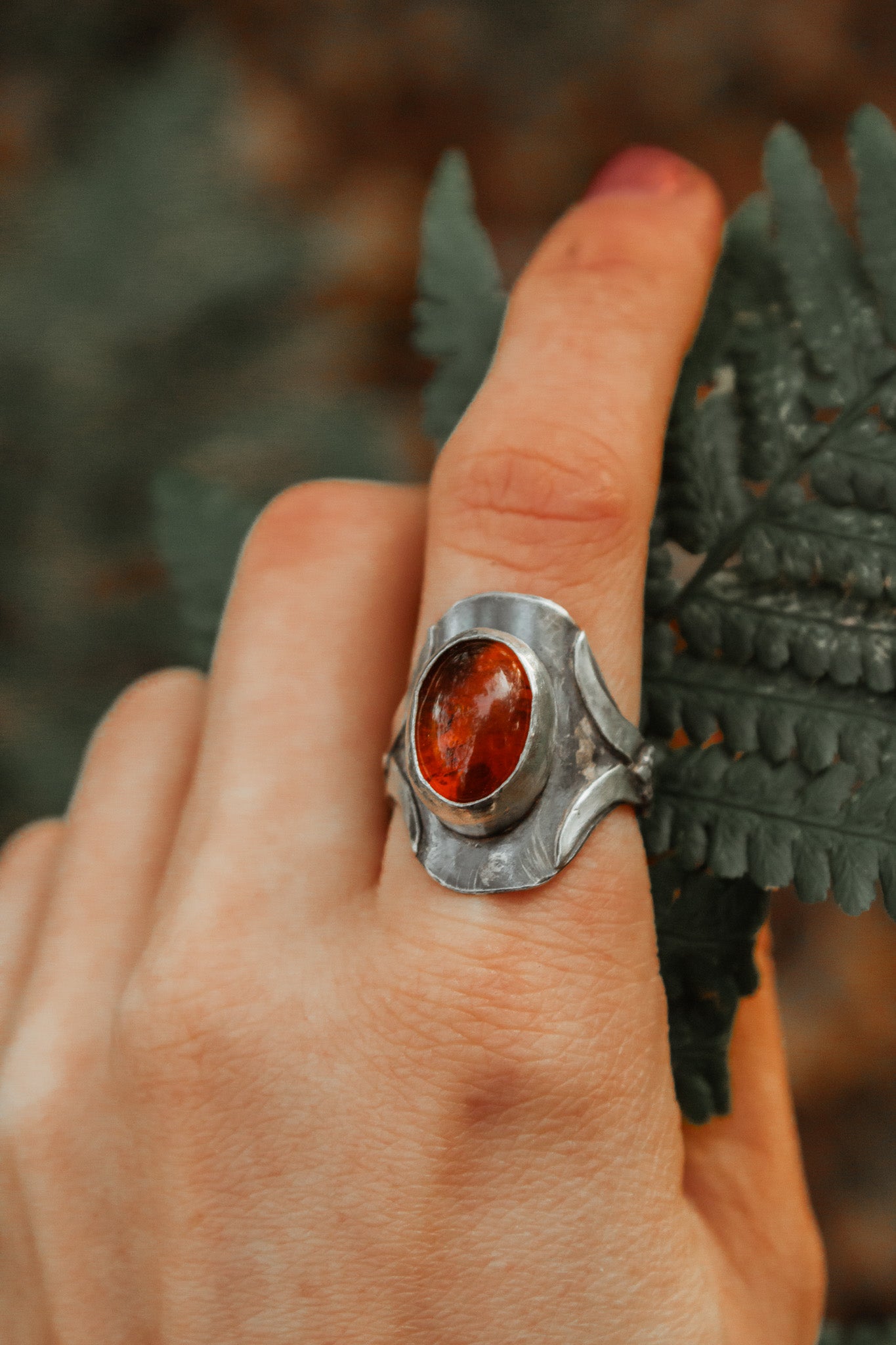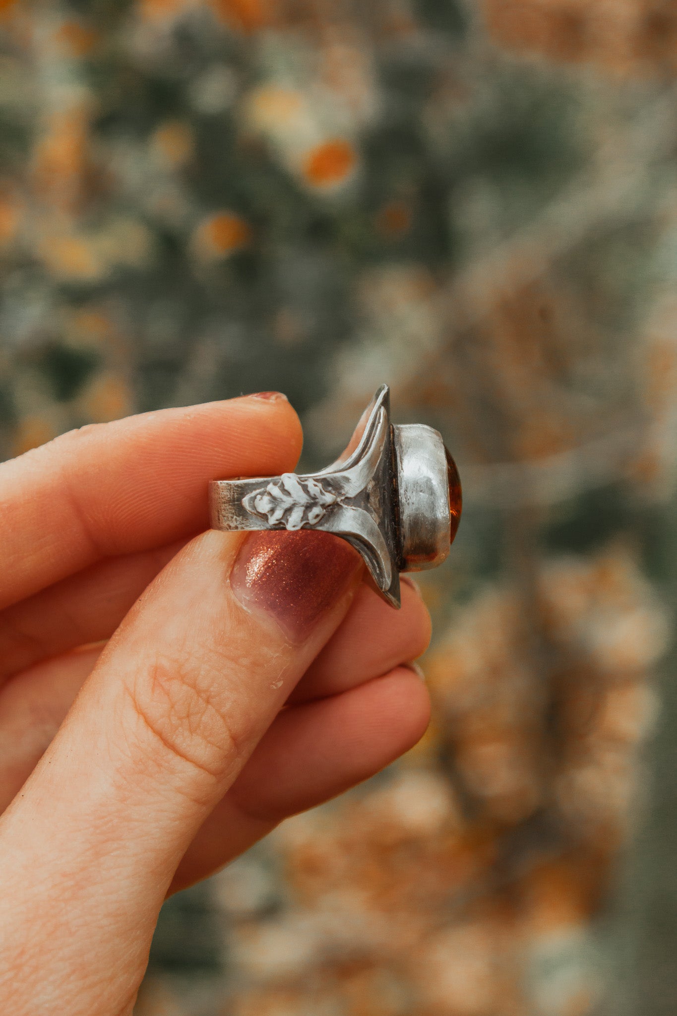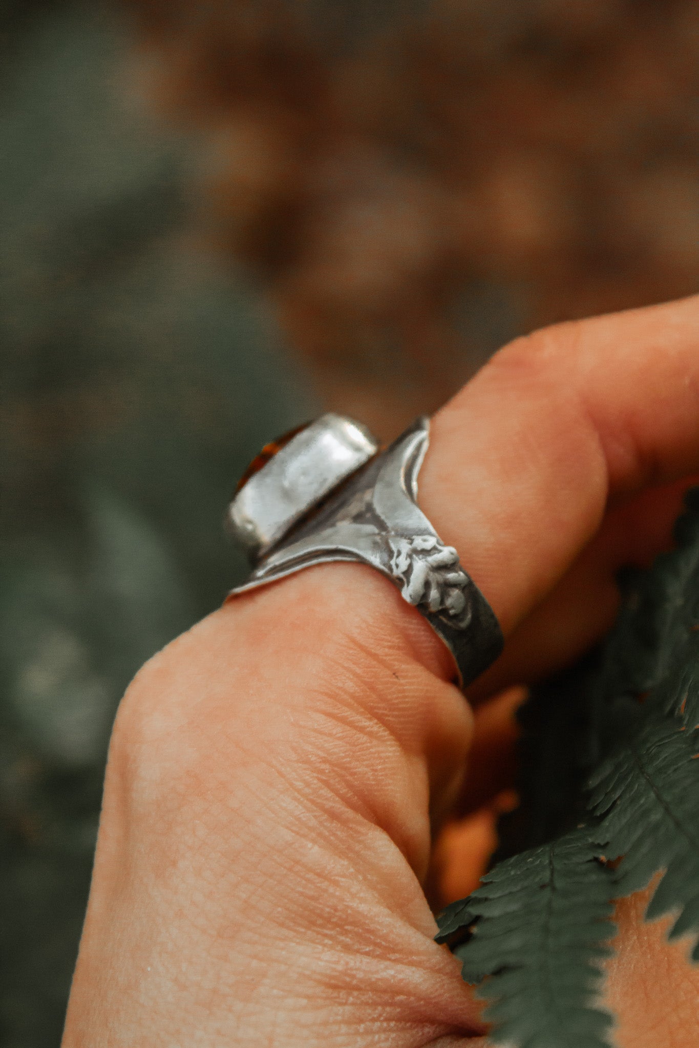 Made from sterling silver and features a warm Amber stone at its centre. Small silver oak leaves rest on each side of the setting, adding a natural detail that pairs with the soft glow of the amber. Amber is known as a stone of renewal and warmth, said to bring lightness and calm to the wearer.