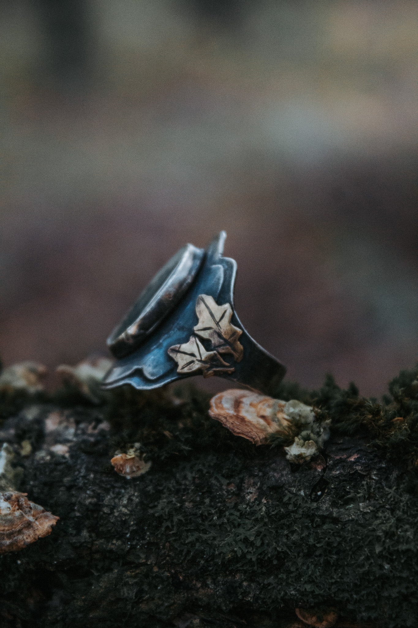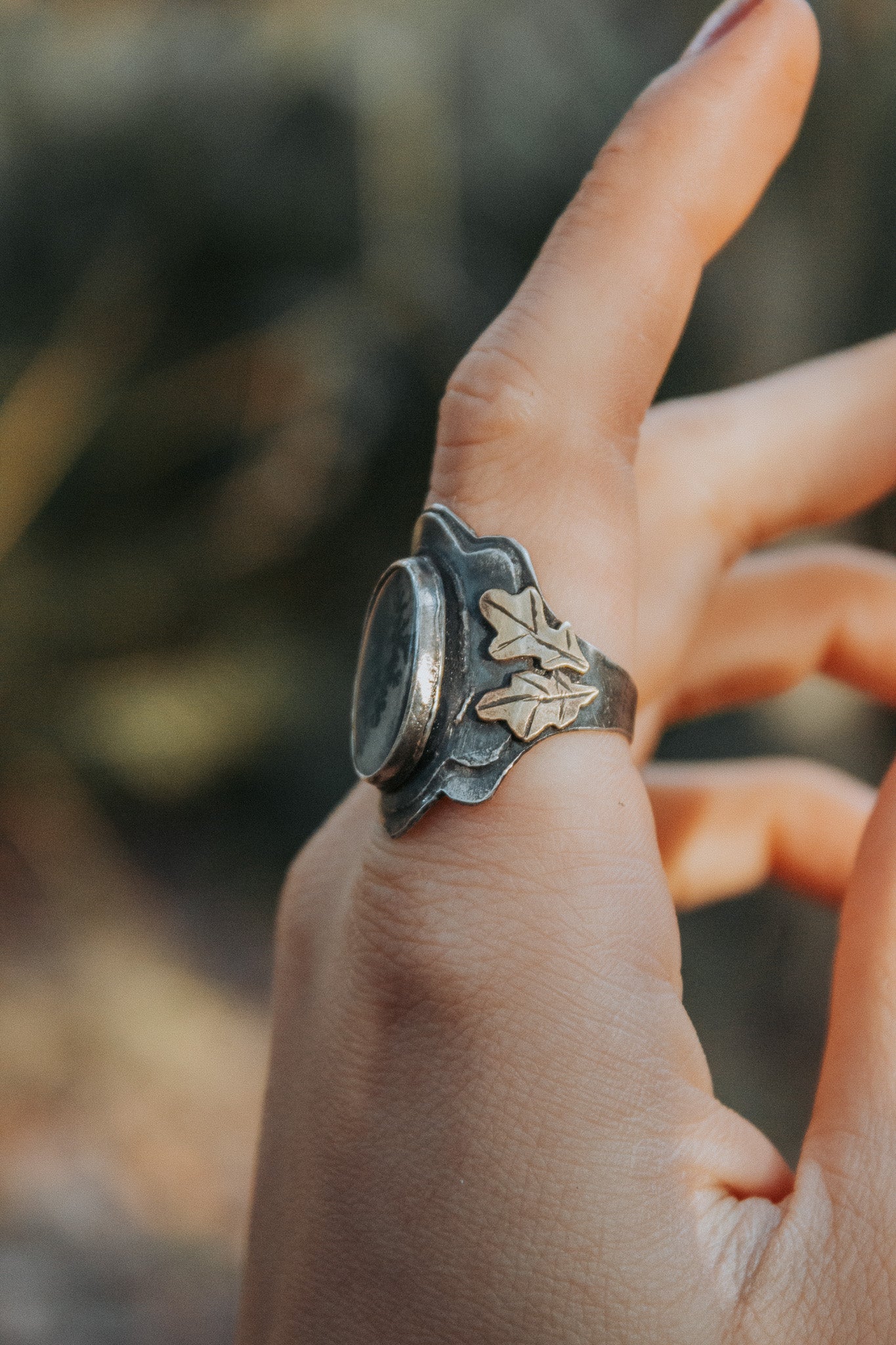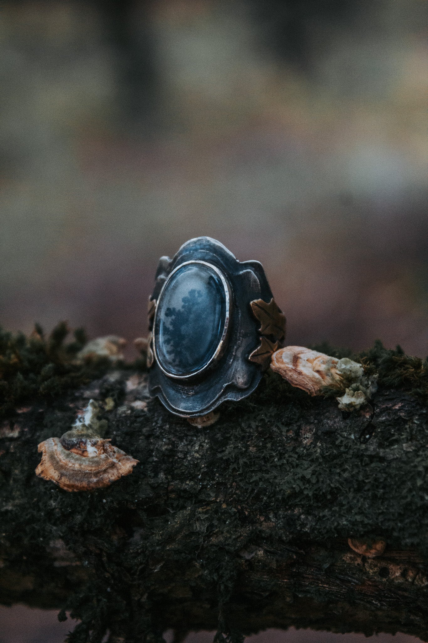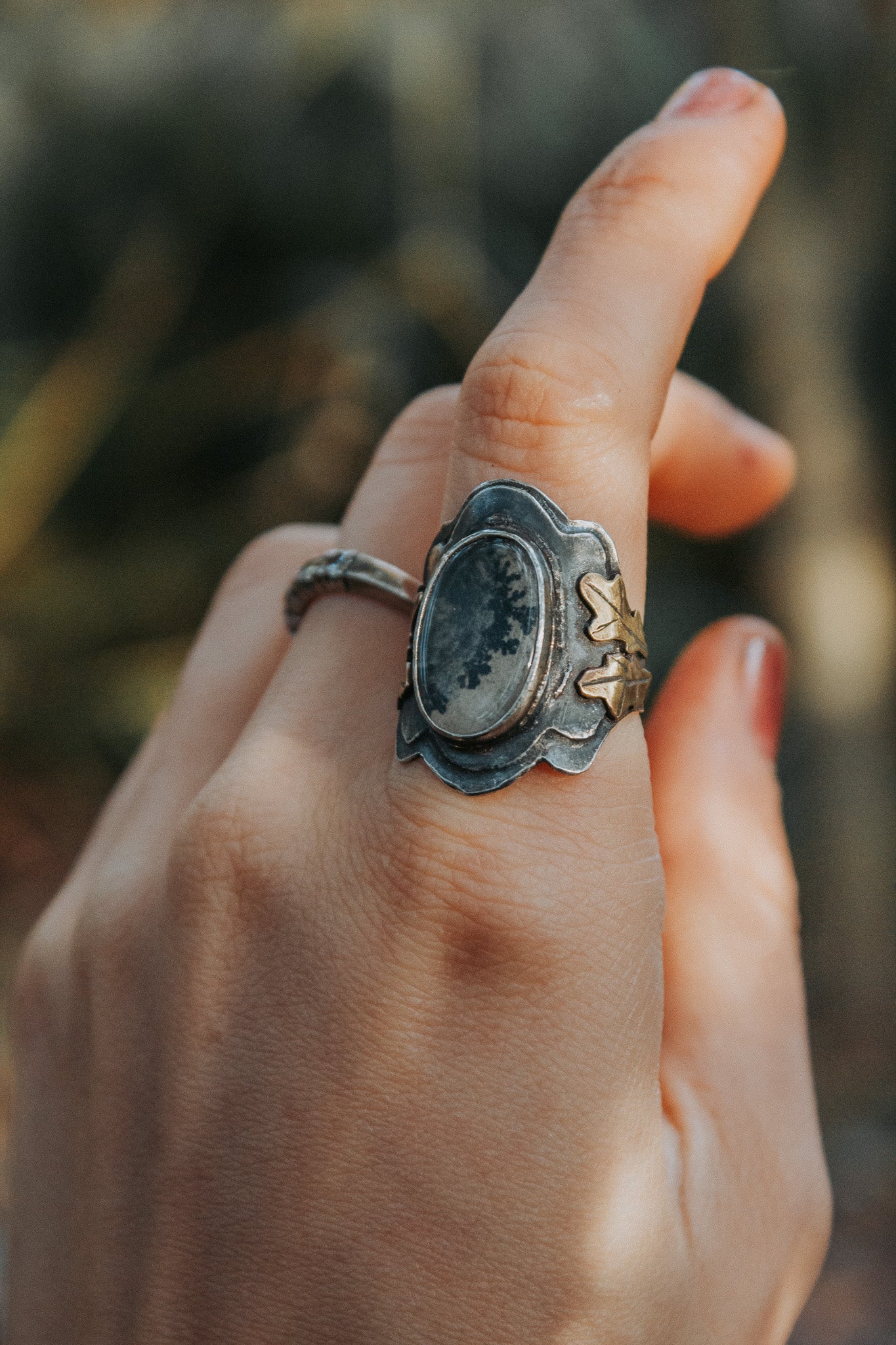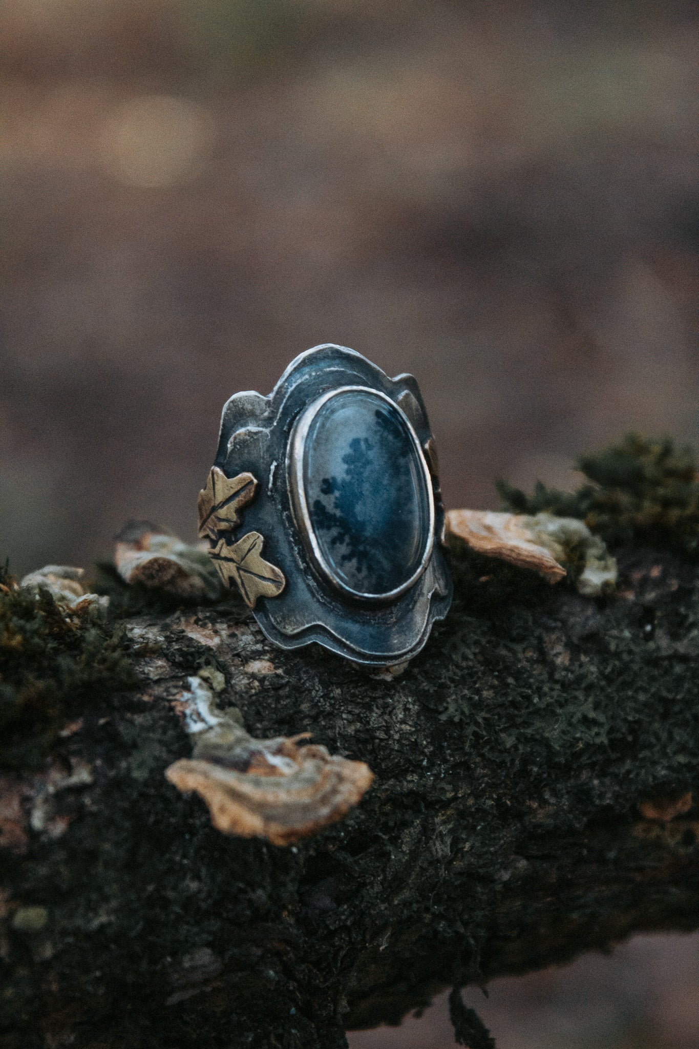 Made from sterling silver and holds a dendrite quartz with soft blue tones that look like moss caught in stone. Small brass leaves rest on each side of the setting, adding an earthy detail that complements the natural patterns within the quartz. Dendrite quartz is known as a stone of growth and connection, said to encourage balance and harmony with nature.
