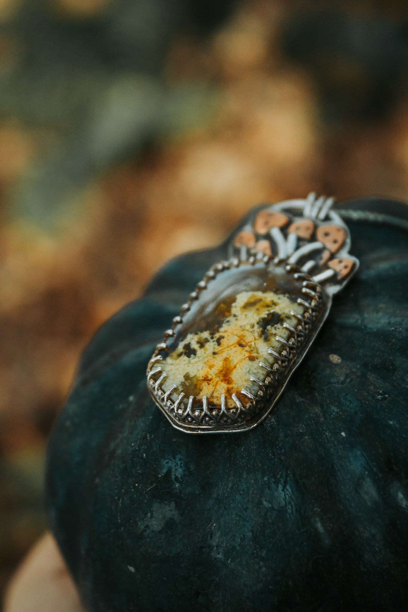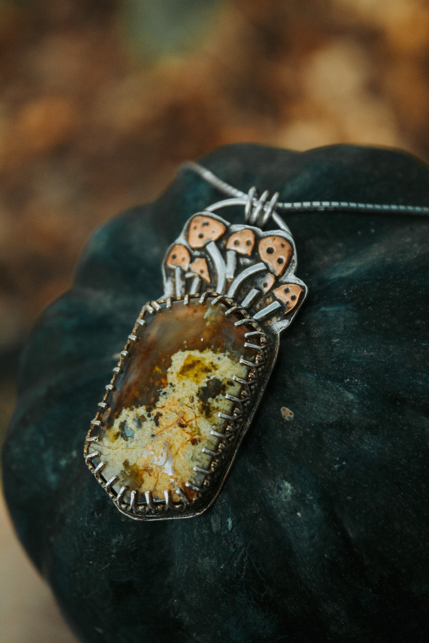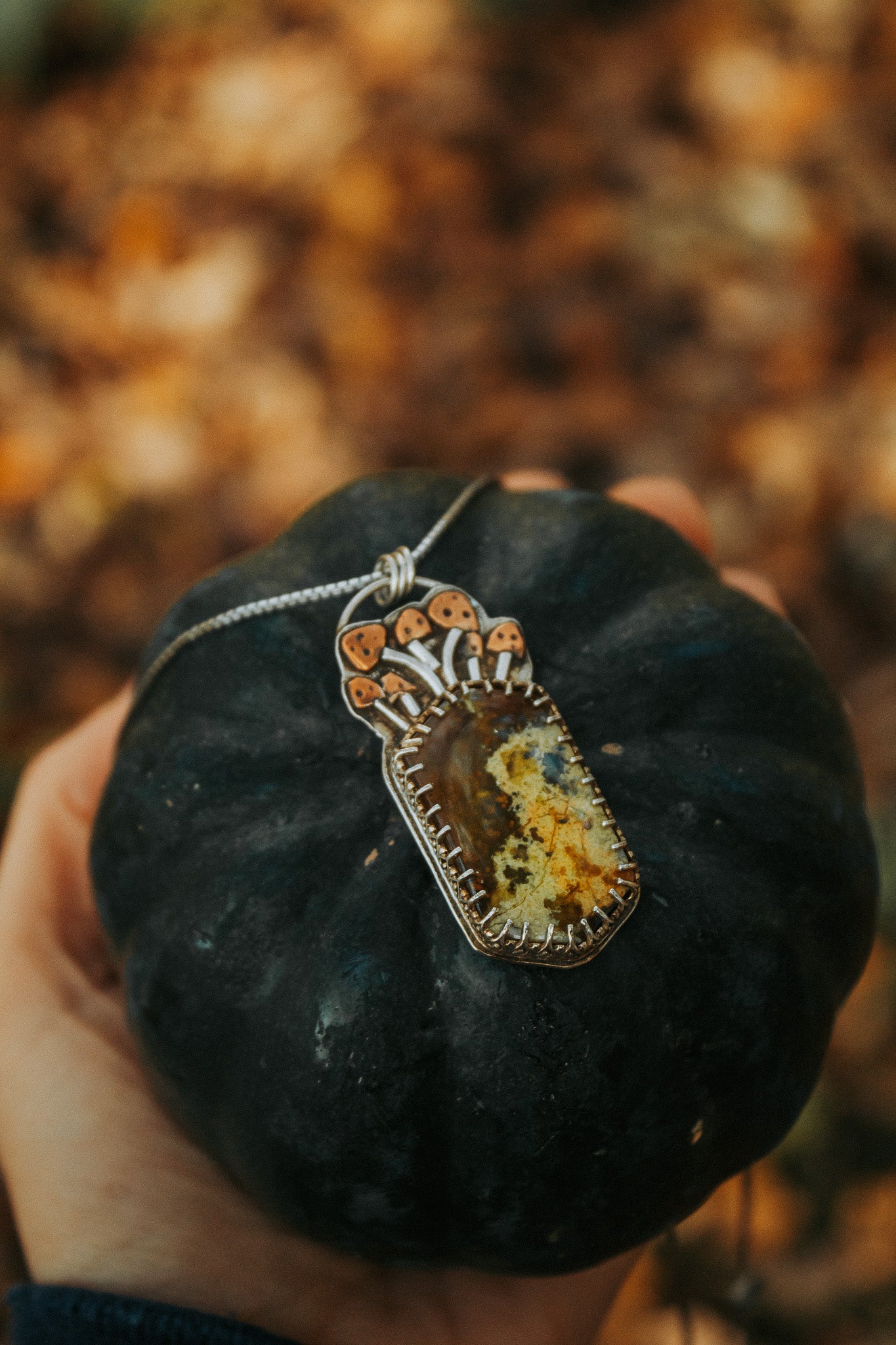 This necklace features a piece of Indonesian green petrified wood, topped with small mushrooms made from sterling silver and copper. The mix of metals complements the earthy tones of the stone, giving the piece a quiet, woodland feel. It comes with your choice of an 18-inch box chain or a 16-inch rolo chain. The necklace shown in the photos is displayed with the 18-inch rolo chain.