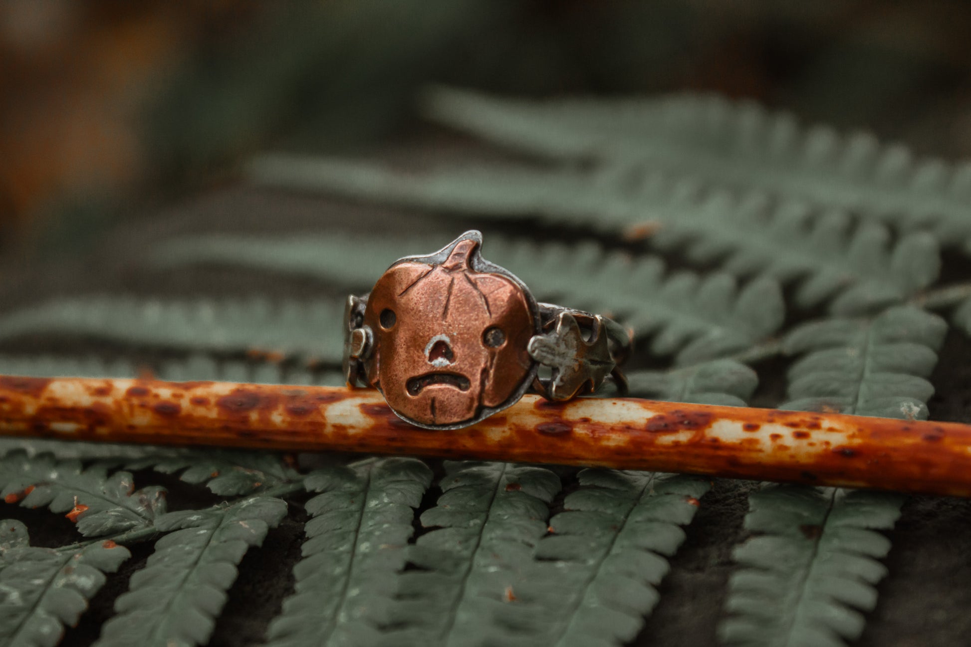 Material: Copper (pumpkin head + vines) + Brass (leaves) + Sterling Silver (band)